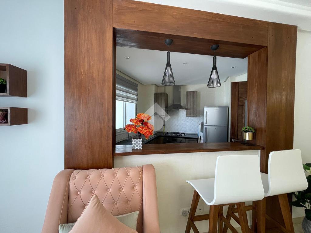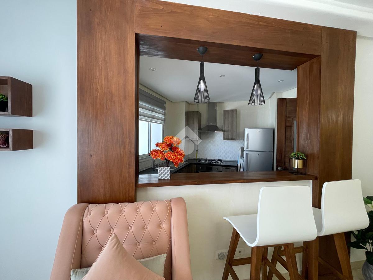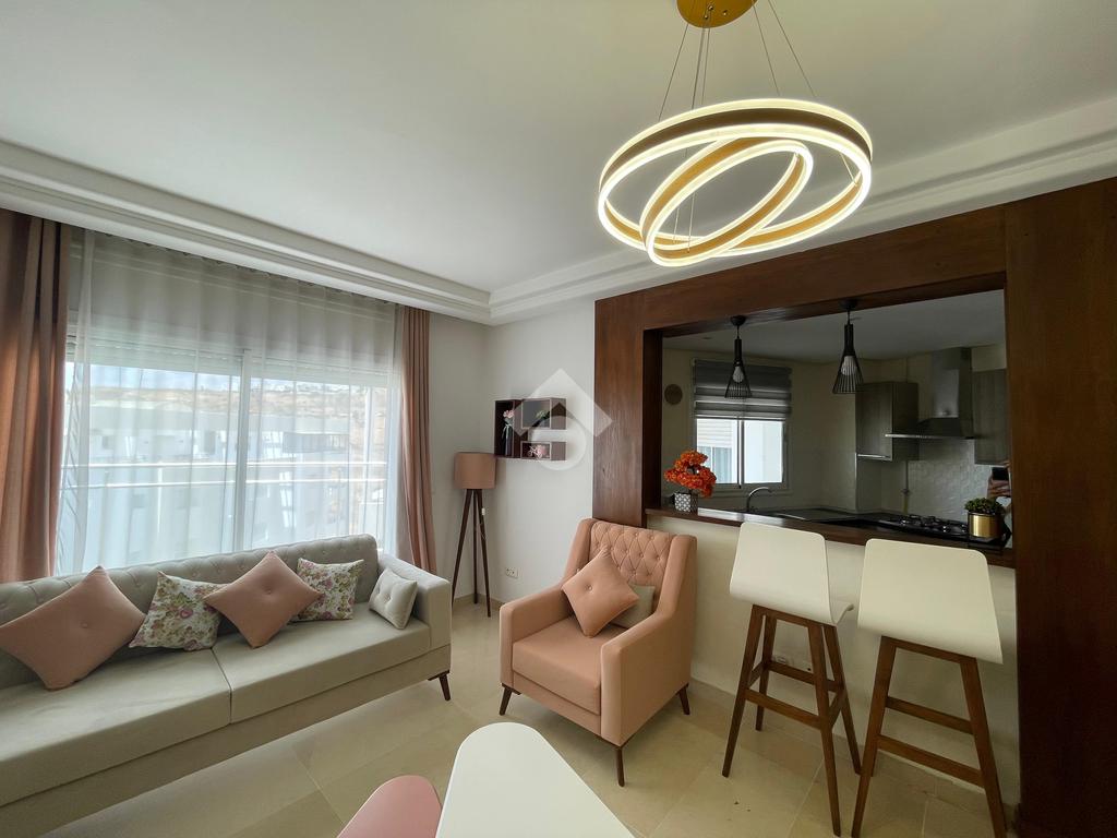 Il se compose d’un salon spacieux avec salle à manger et balcon, d’une cuisine équipée (hotte, plaque, four) avec mini-bar ouvert sur le salon, d’une chambre à coucher avec dressing et balcon, ainsi qu’une salle d’eau avec cabine de douche.