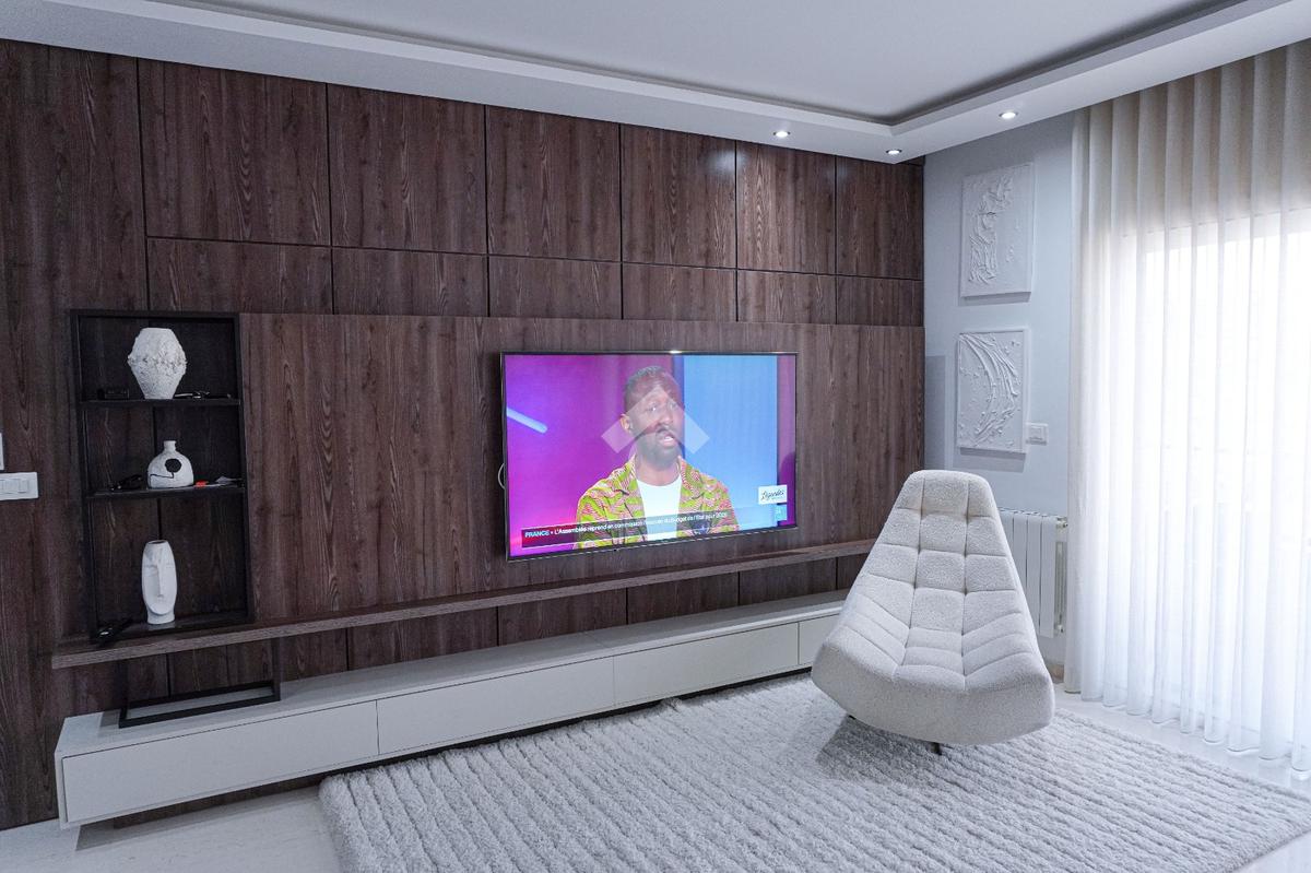 Le salon, sublimé par un habillage raffiné, s’ouvre sur un balcon avec vue dégagée et dispose également d’un point d’eau pour les invités.