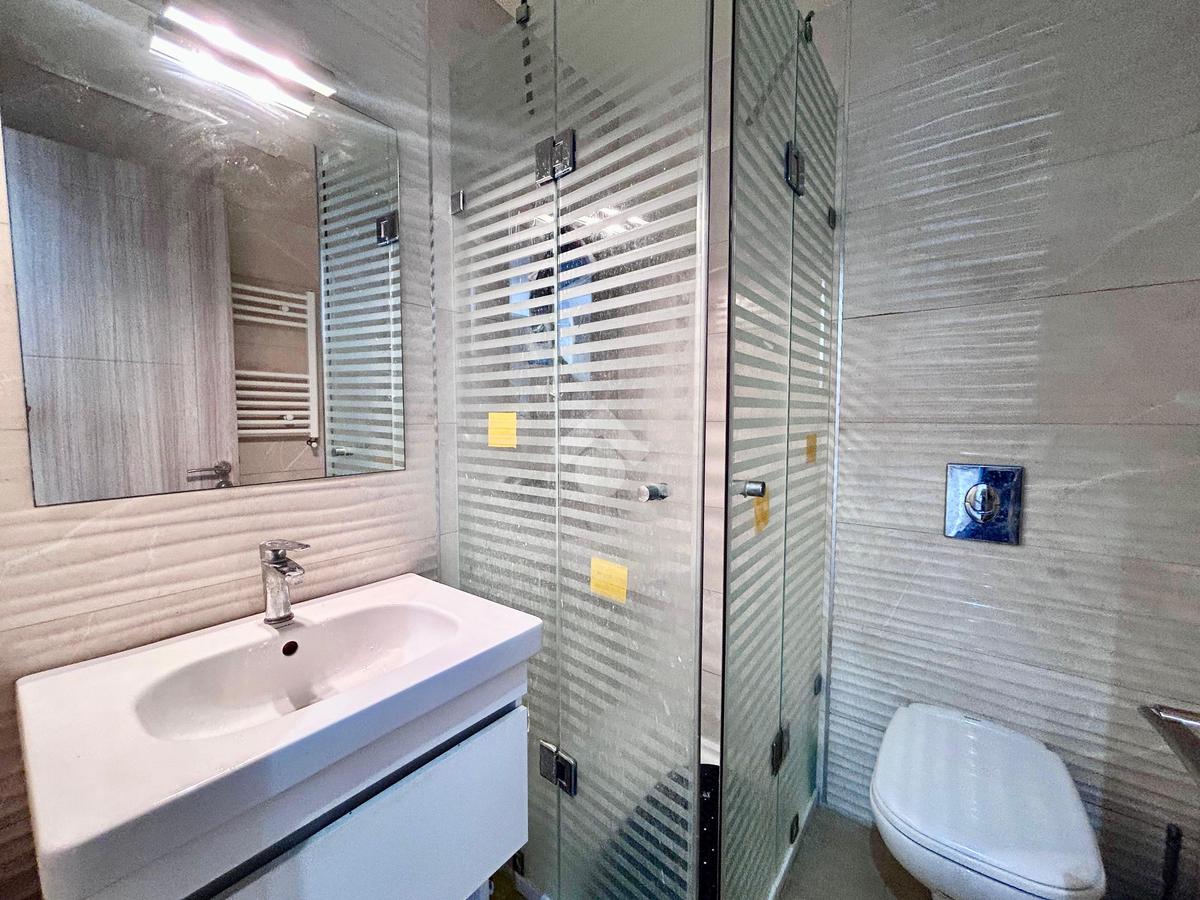 La salle d’eau est équipée d’une cabine de douche moderne.