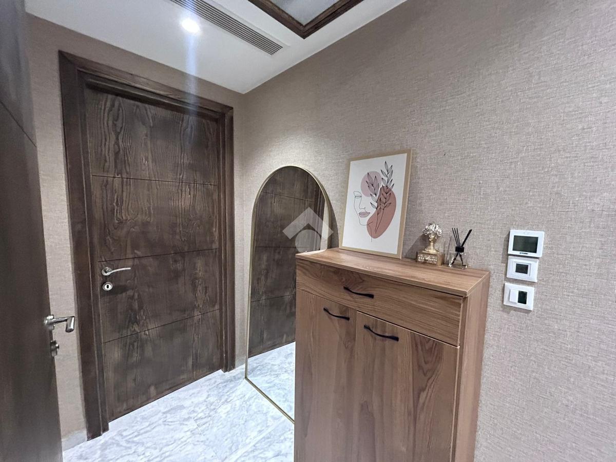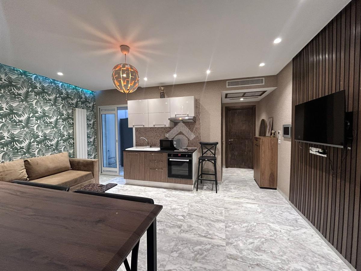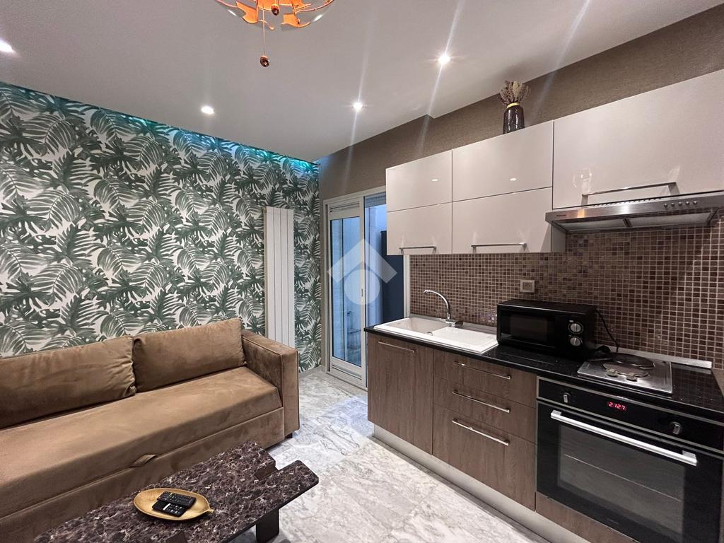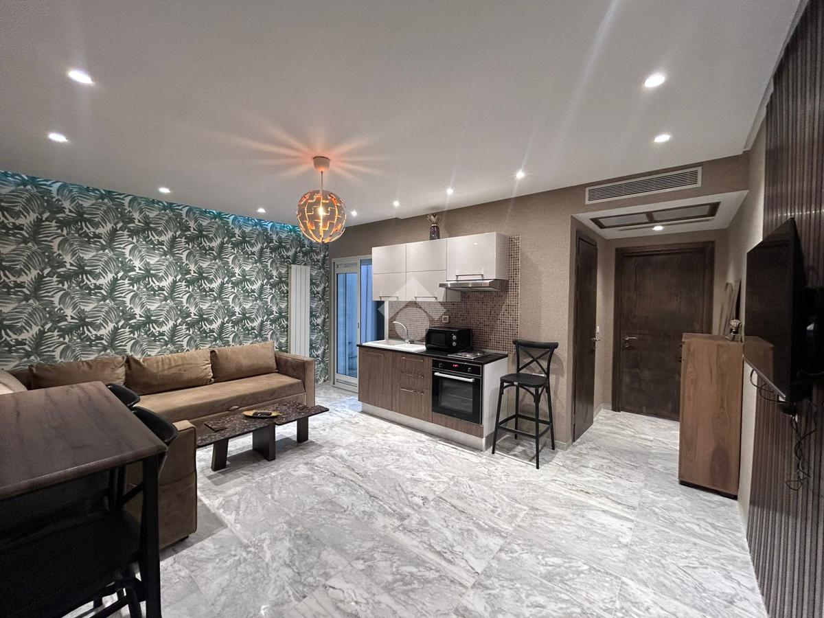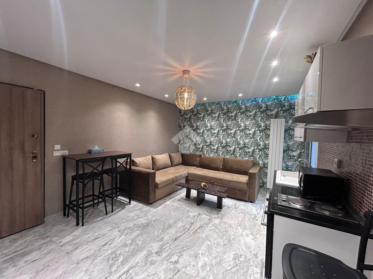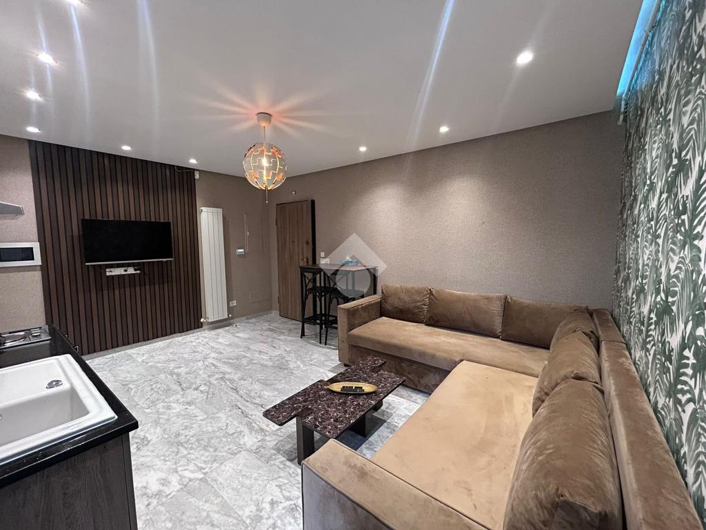 L’entrée s’ouvre sur un salon chaleureux, caractérisé par des couleurs foncées qui lui confèrent un charme particulier, ainsi qu’une kitchenette ouverte sur l’espace de vie.