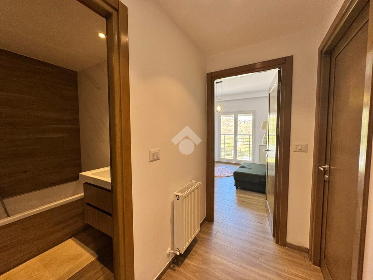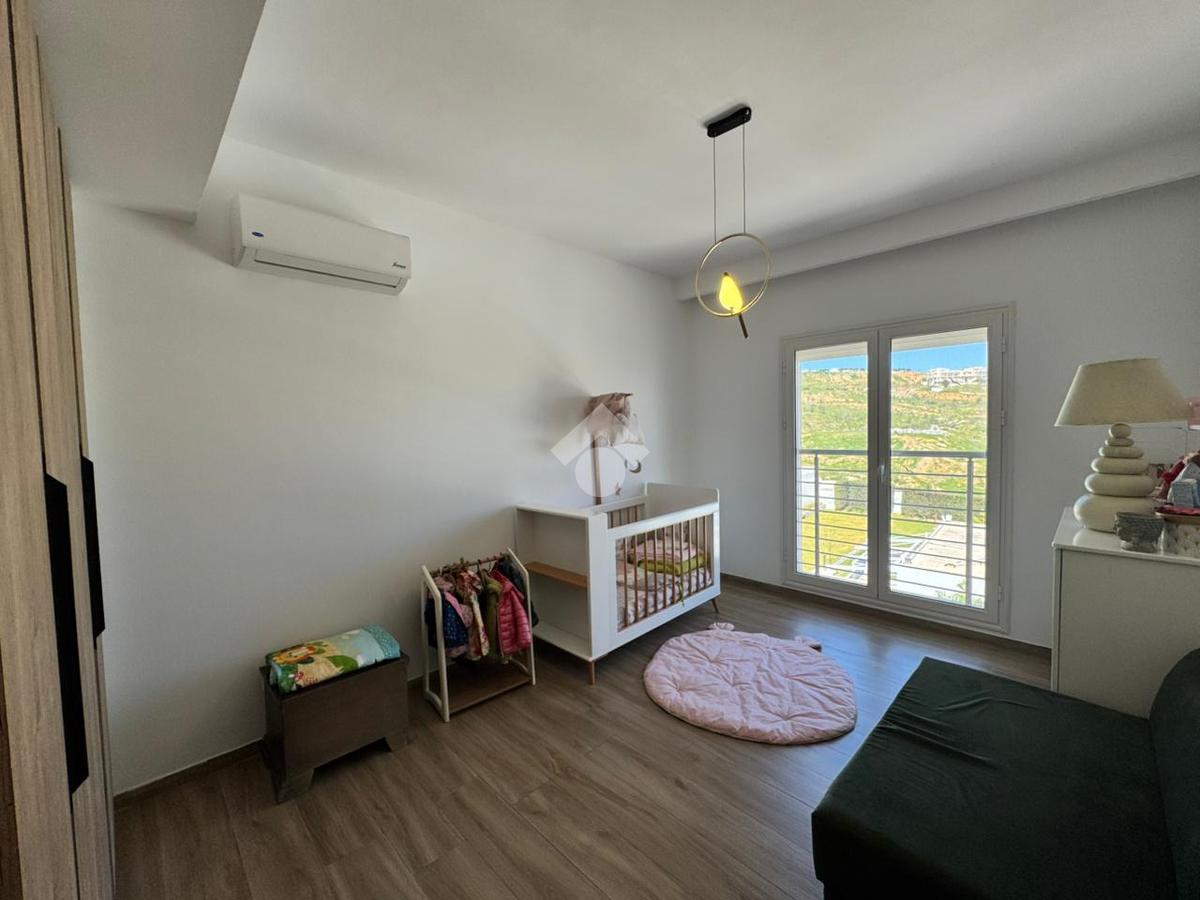 L’entrée dessert une pièce de vie composée d’un salon et d’une salle à manger, ouvrant sur un balcon offrant une vue dégagée. La cuisine est entièrement aménagée et équipée (plaque, hotte, four) et dispose d’un séchoir. Une salle d’eau invités complète cet espace.